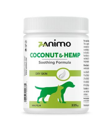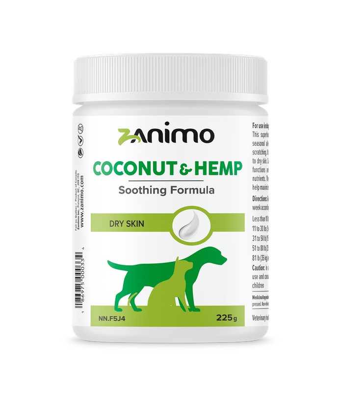 Coconut and Hemp is a dietary supplement that combines two oils with moisturizing and emollient properties for a beautiful, healthy coat. Coconut oil and organic hemp seed oil are rich in essential fatty acids (omega-3 and omega-6), vitamins and minerals. Its soothing, antioxidant formula helps relieve itching and scratching due to allergies.