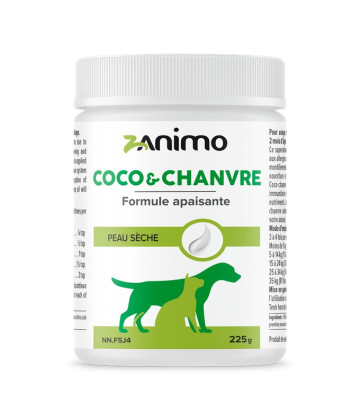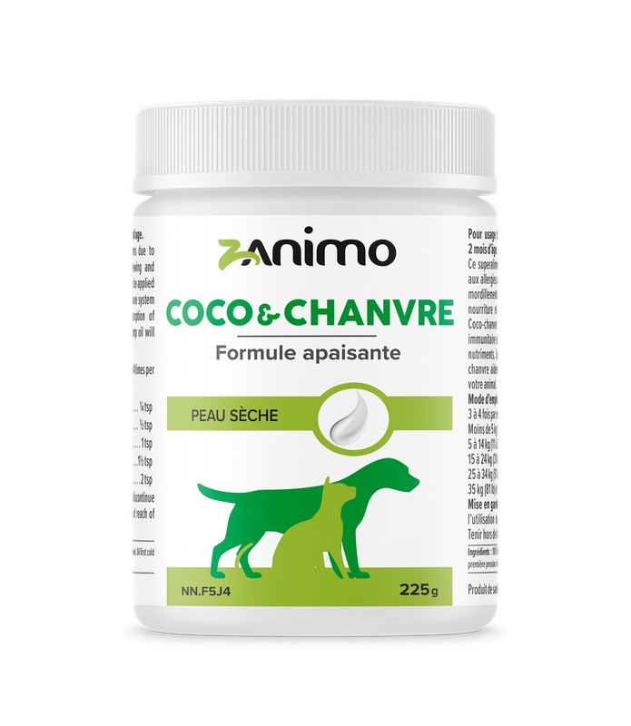 Coco-Chanvre est un supplément alimentaire qui combine 2 huiles hydratantes et émollientes pour la santé et la beauté du pelage. Les huiles de coco et de chanvre biologique regorgent de bienfaits riches en acides gras essentiels (oméga 3 et 6), en vitamines et en minéraux. Sa formule est apaisante et antioxydante pour la peau et aide à diminuer les démangeaisons et le grattage dus aux allergies.